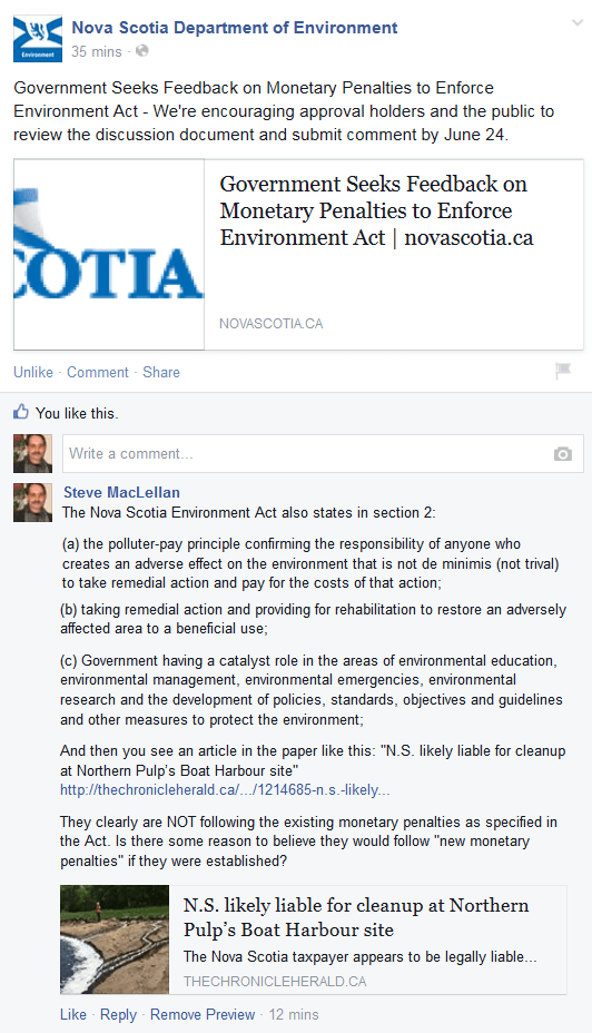 The Nova Scotia Department of Environment on Facebook posted the link to the press release and a short conversation ensued: